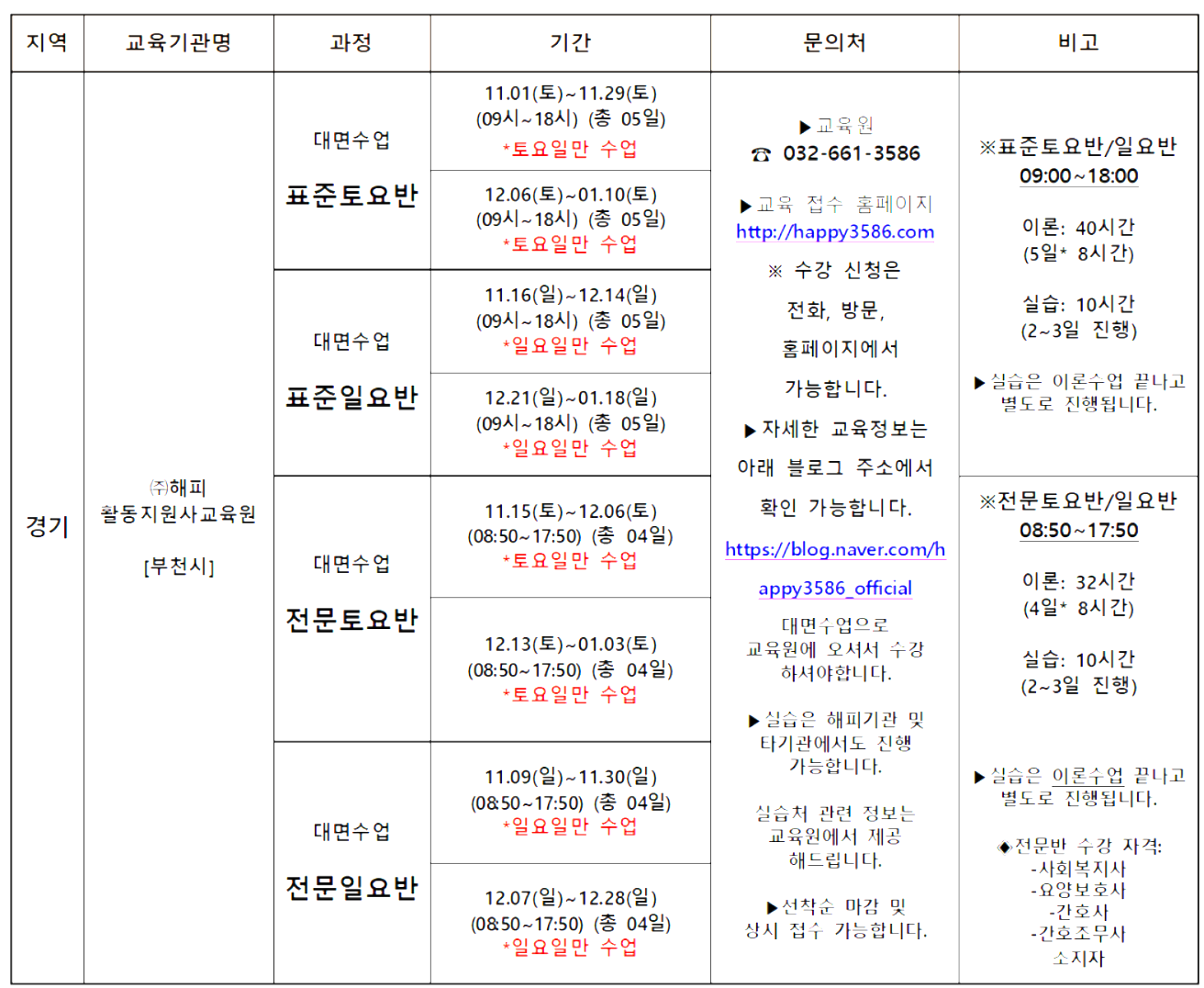 표준과정: 11월8일(토),9일(일),15일(토),16일(일),22일(토) / 전문과정: 11월8일(토),9일(일),15일(토),16일(일) / *실습 : 이론 교육 종료 후 10시간 진행(기간제한 없음) 접수 : 10.1.(수)09:00~ 선착순으로 마감함 |