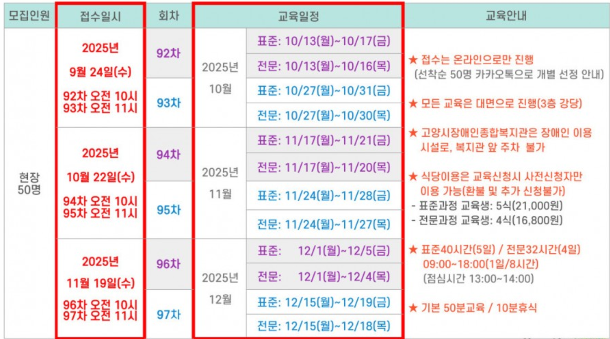| 24회 | 토요반 9/20 9/27 10/11 10/18 10/25 일반교육 총 5일간 | 토요반 9/20 9/27 10/11 10/18 유사교육 총 4일간 |
