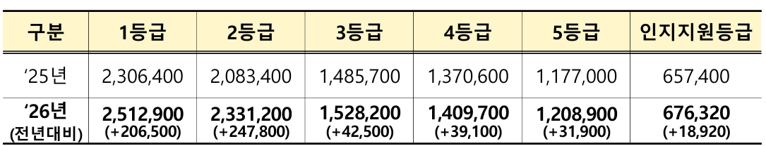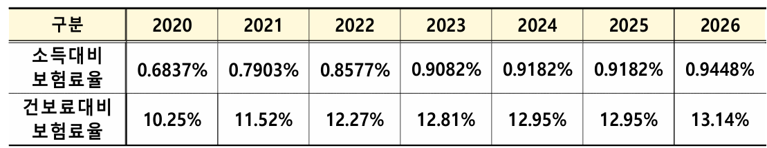 2026년 가입자 세대당 월 평균 보험료는 18,362원으로 올해 대비 517원이 증가한다. 건강보험료 대비 13.14%이다.