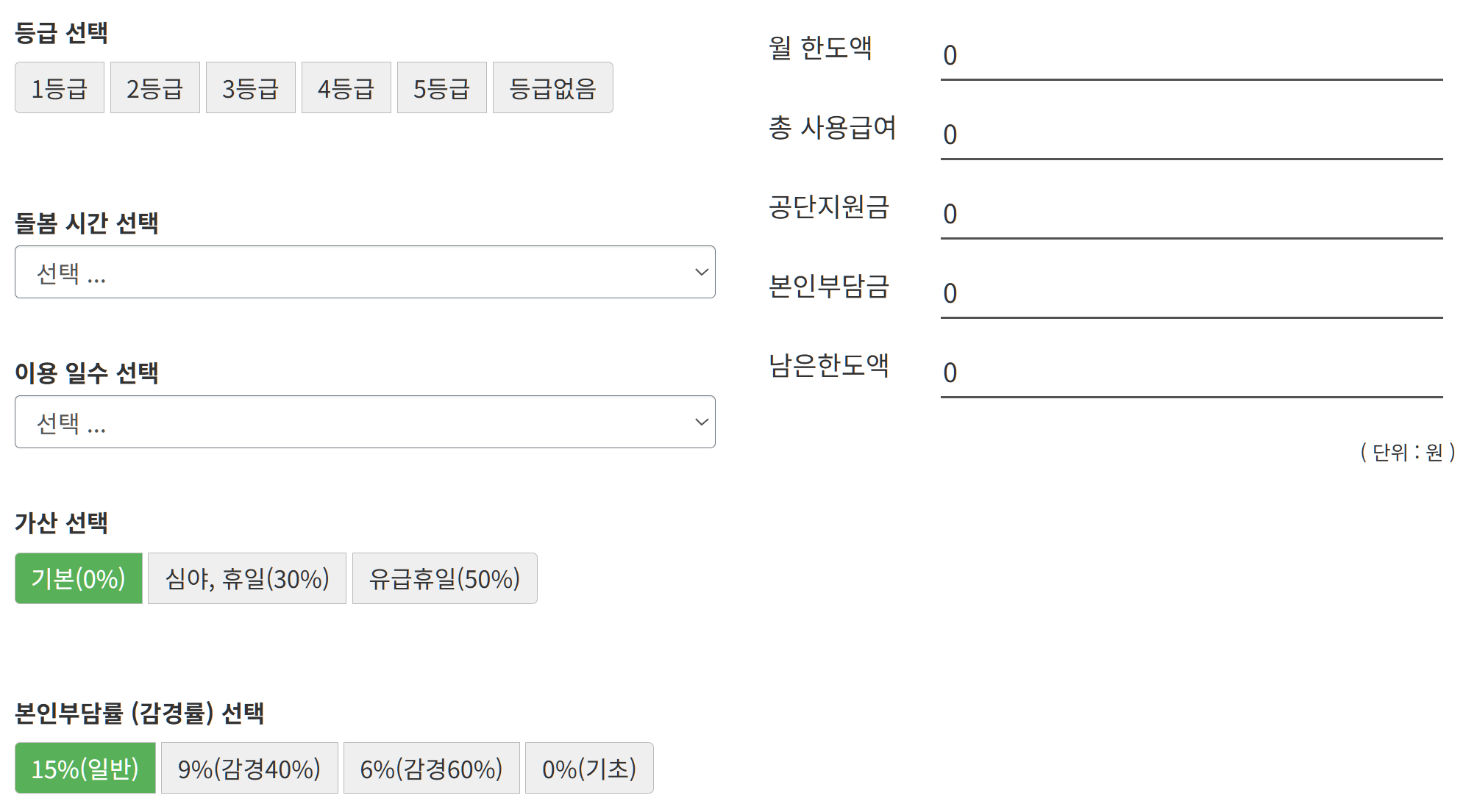 모의계산기를 이용하면 이용시간별 월 한도액에 사용량, 다른 재가서비스와 연동해서 확인해 볼 수 있다.