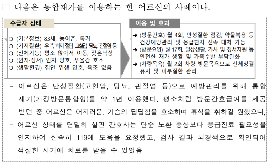 ○ 이처럼 통합재가 서비스는 전문가들이 매월 요양 목표를 점검하여 장애요소를 해결하는 과정과 함께, 간호사의 전문성과 반복적인 예방관리로 치료시점을 놓치지 않게 하고,
