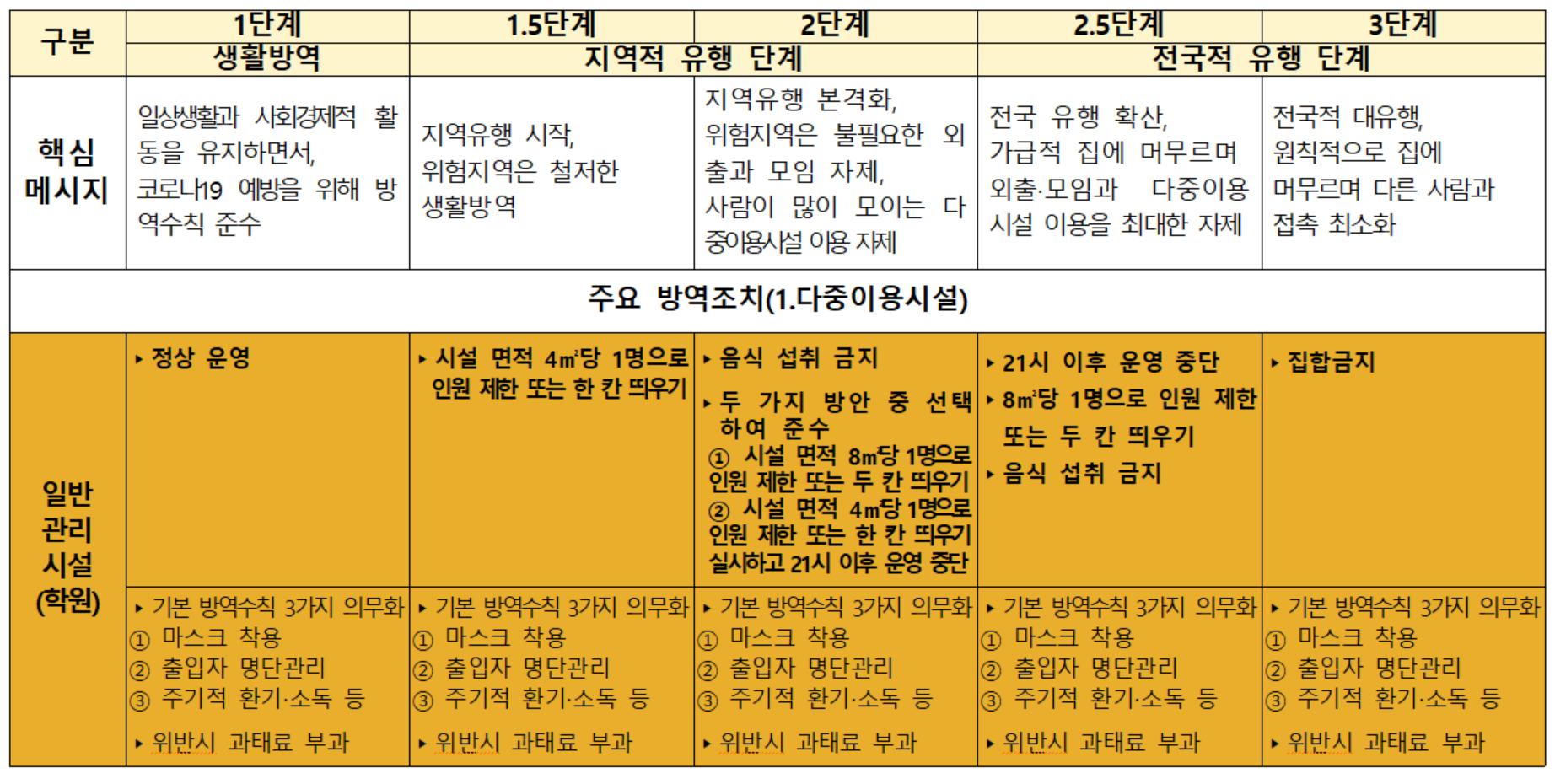 거리두기 단계별 기준 및 방역 조치 (학원용)