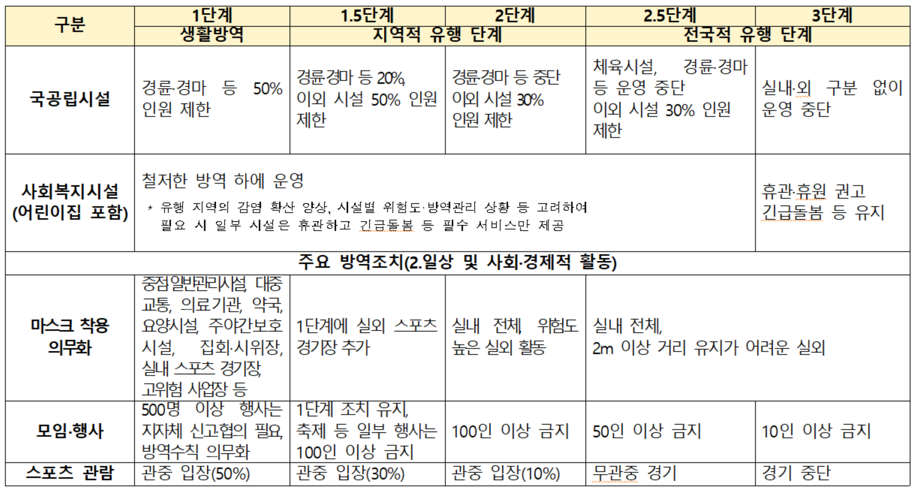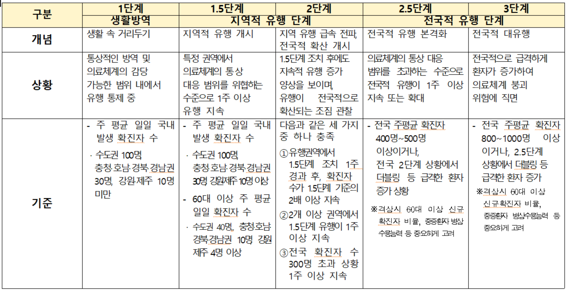 거리두기 단계별 기준 및 방역 조치 (요약)