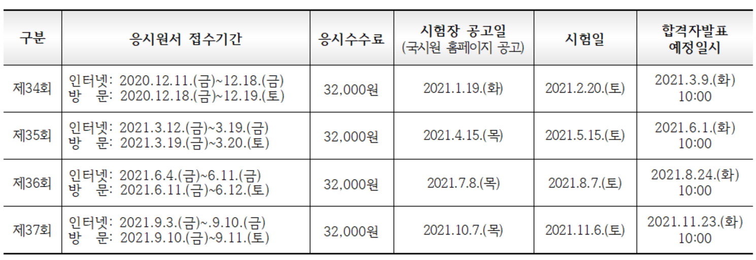 2021년의 첫 시험인 제34회는 2021년 2월에 있다. 응시 접수는 12월 11일부터 시작한다.