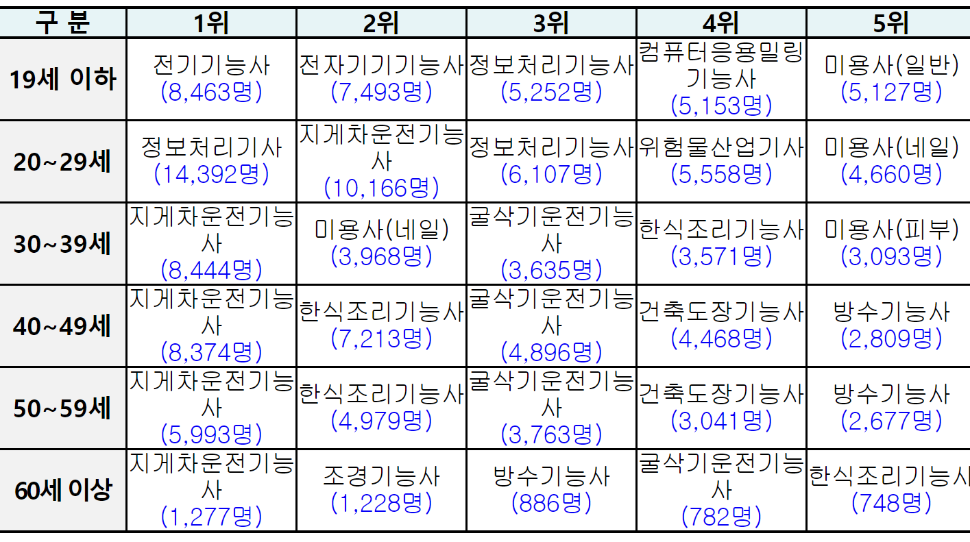 연령병 자격층 취득 선호 종목