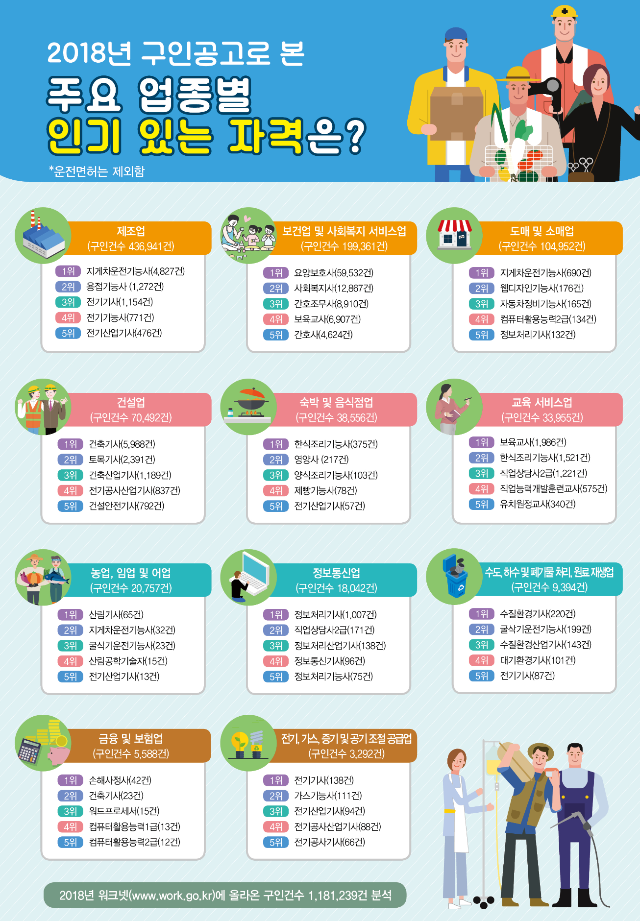 데이터는 2018년도 워크넷 구인 공고 118만 건을 분석한 결과이다.