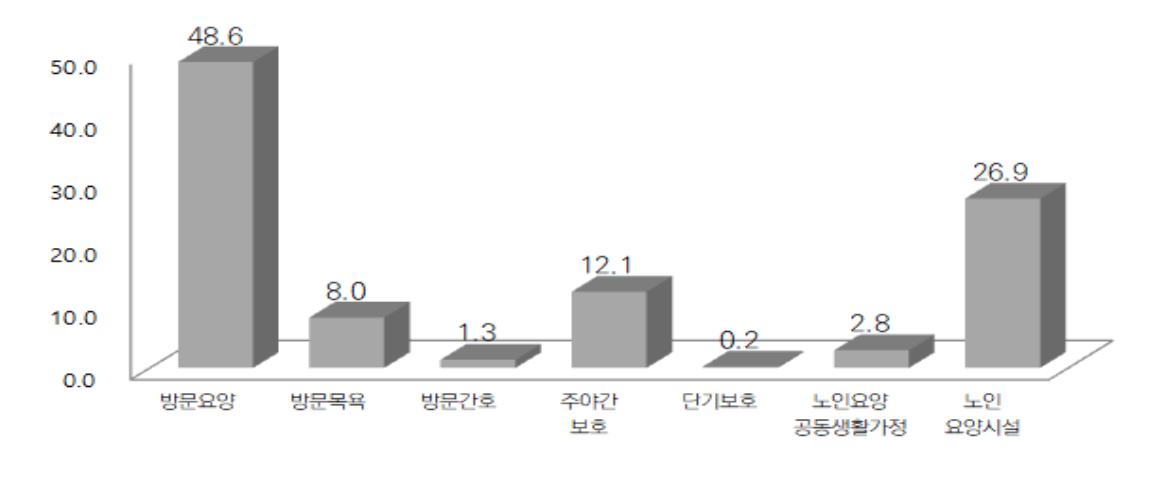 시설 급여 이용자 중 90.6%가 노인요양시설을, 9,4%는 공생을 이용하고 있다.