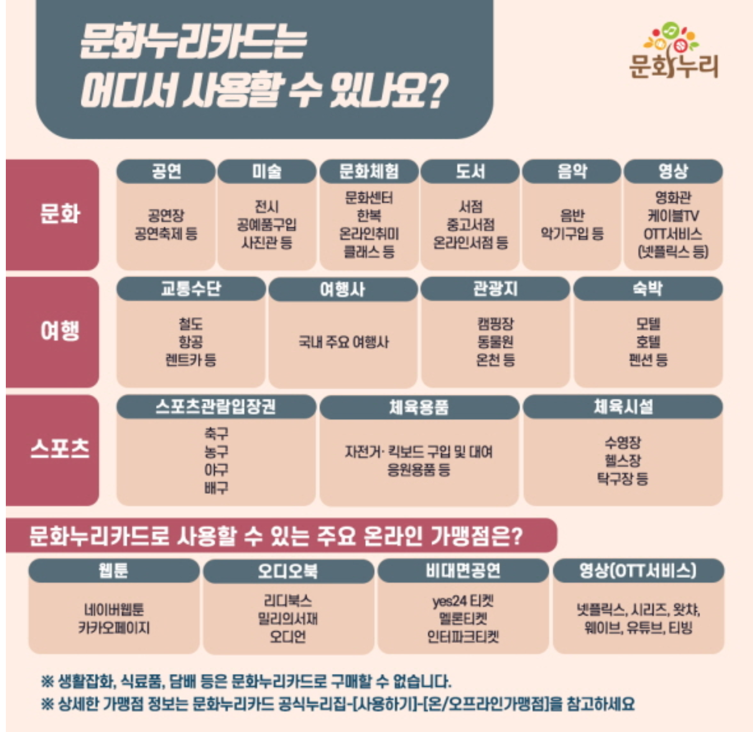 문화누리카드는 공연, 전시회, 관광지 뿐 아니라 넷플릭스 같은 OTT 서비스, 유튜브 프리미엄 및 멜론 같은 음원 사이트 결제도 가능하다.