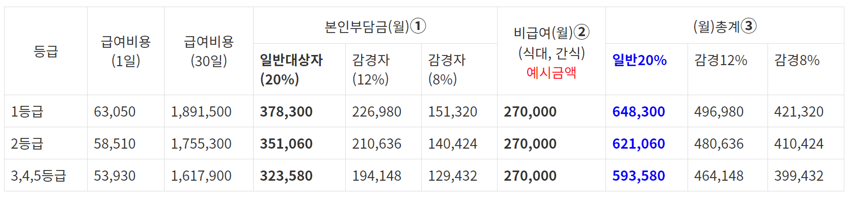 위 표는 한 달 입소 시 본인부담금과 비급여, 감경 대상자 일 경우를 포함하고 있다.