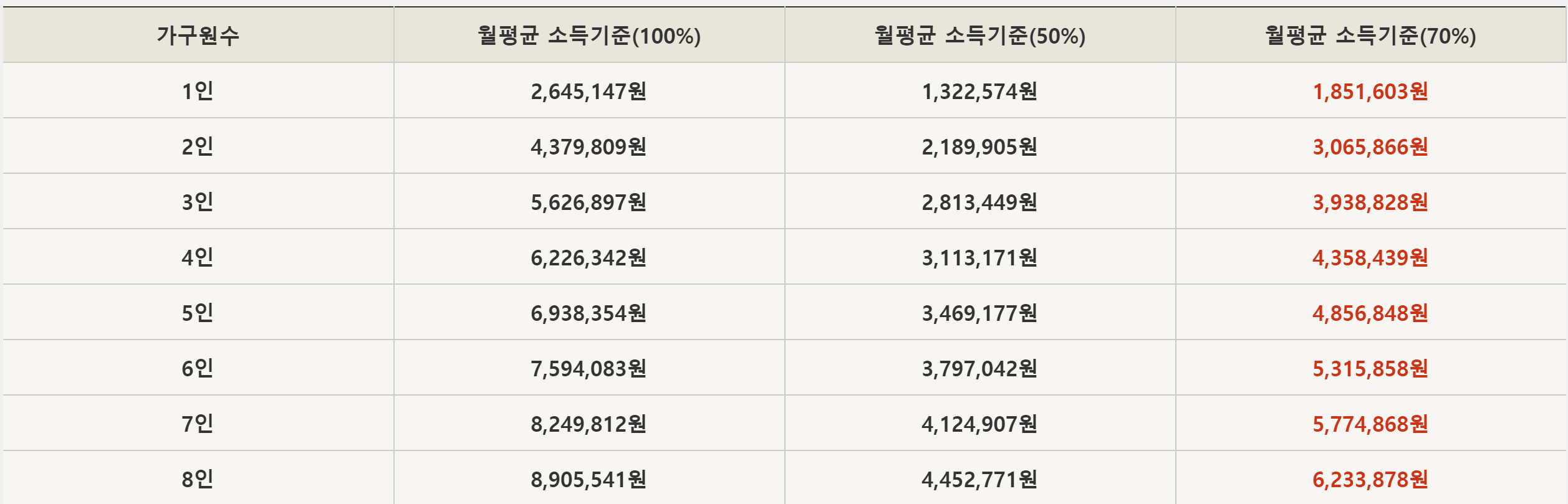( 소득 전년도 도시근로자 가구원수별 가구당 월평균소득의 70% 이하 )
