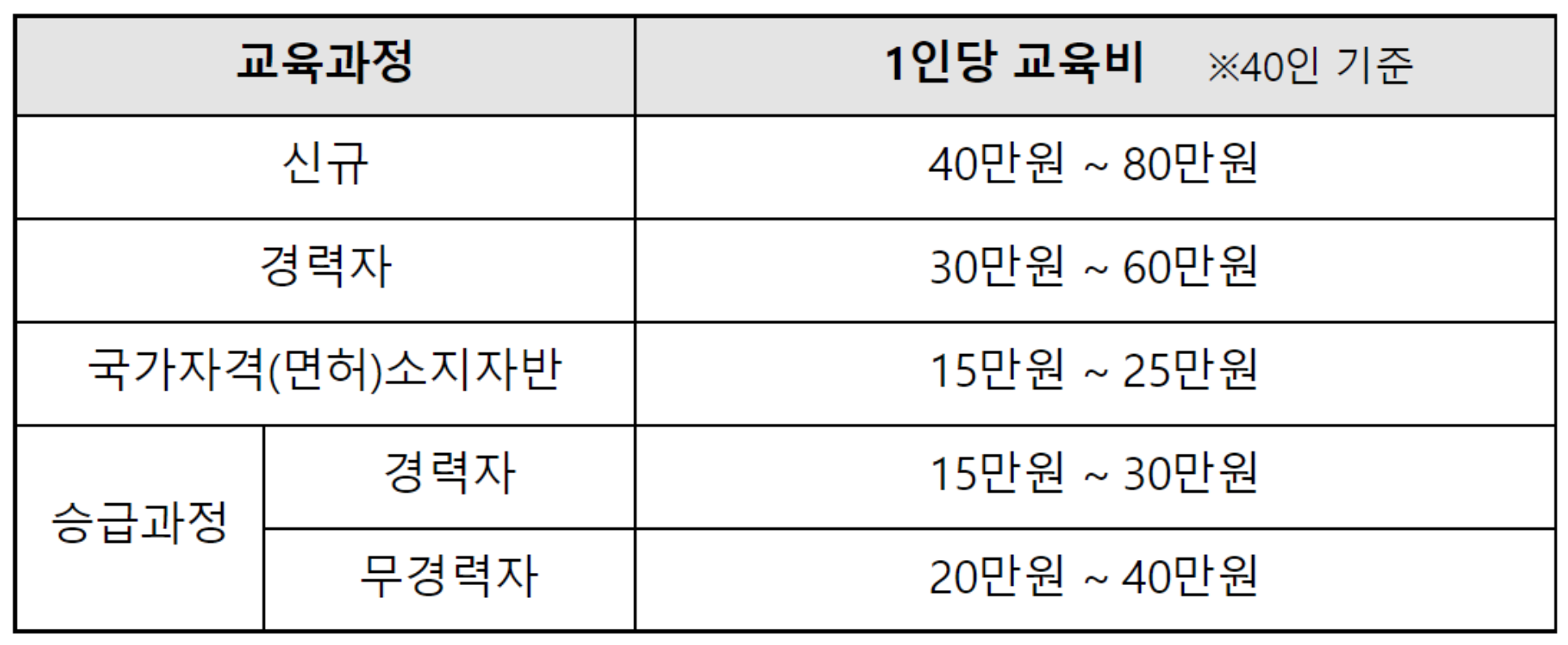 ※ ’19년도 제29회차(’19.11.2) 시험을 위한 교육과정부터 수강료를 ‘신규 45만원~80만원 / 국가자격(면허)소지자반 20만원~25만원’으로 하한액 변경