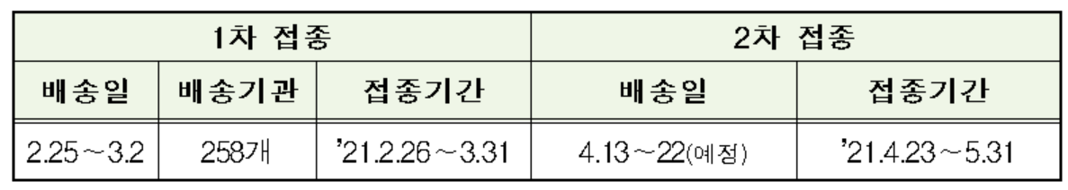 ○ (1차 접종) 접종기간(2.26~3.10) 초기에 가급적 접종이 완료될 수 있도록 하고, 접종당일 발열 등으로 접종 제외되었던 대상자는 1차 접종기간 내(~3.10일 까지) 접종 완료 필요