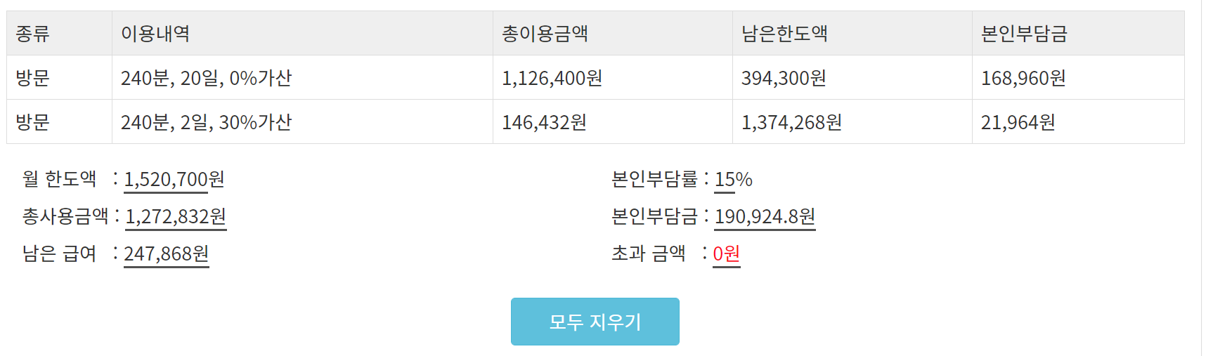 저장된 이용요금은 위와 같이 목록 형태로 보여주고, 전체 합계를 내어 다시 본인부담금 총 금액을 계산해 준다.