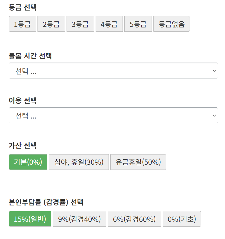 또한 등급이 없는 이용자 일 경우에도 장기요양 기준으로 얼마나 나올지 비용을 계산해 준다. 무등급자가 요양 서비스를 이용할 경우에 비용을 예상할 수 있도록 만들었다.