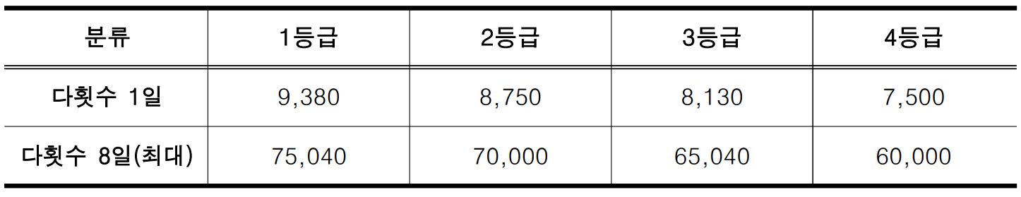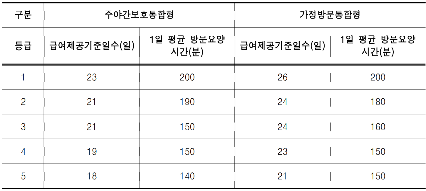 - 기준 : 등급별 월 8일 이상 또는 주 2일 이상 다횟수 방문요양 제공