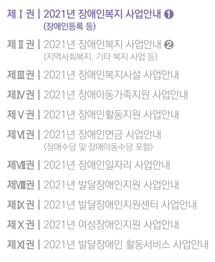 2021년 장애인복지 사업안내 1권의 주요 목차는 아래와 같다.