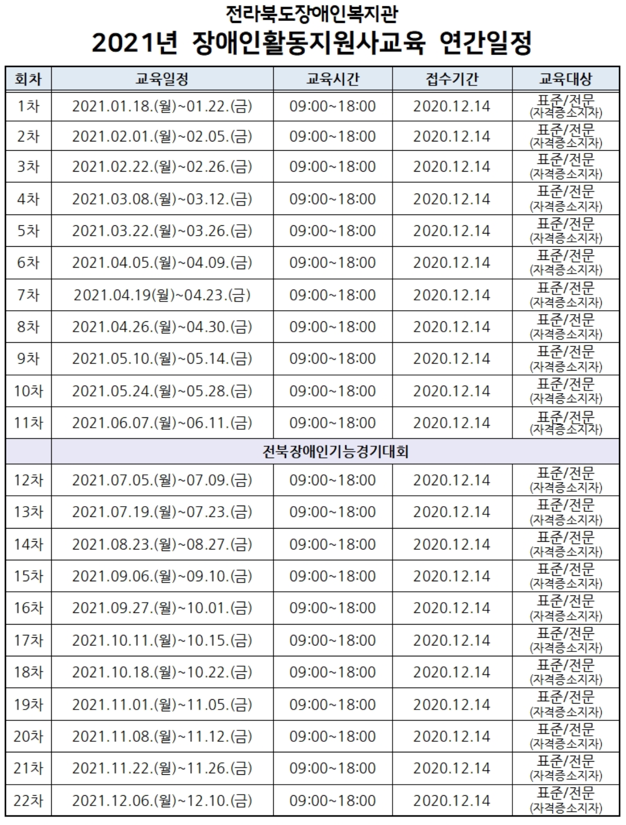 | 4월 장애인 활동지원사 양성 교육 일정표 ( 서울, 경기, 대전, 경북, 경남, 대구, 부산,세종 ) (0) | 2021.03.31 |