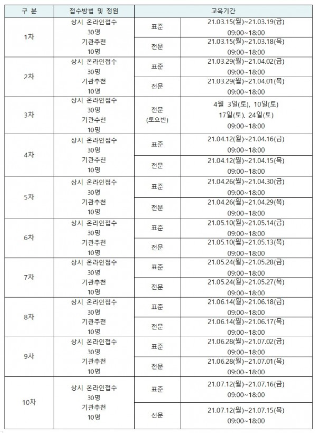 교육신청은 2주전 홈페이지를 통해서 신청이 가능하며, 선착순 접수로 진행되며, 컴퓨터/모바일을 통해 모두 가능하다.