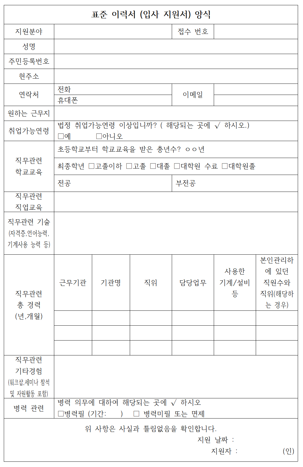 표준이력서 양식 다운로드 받기