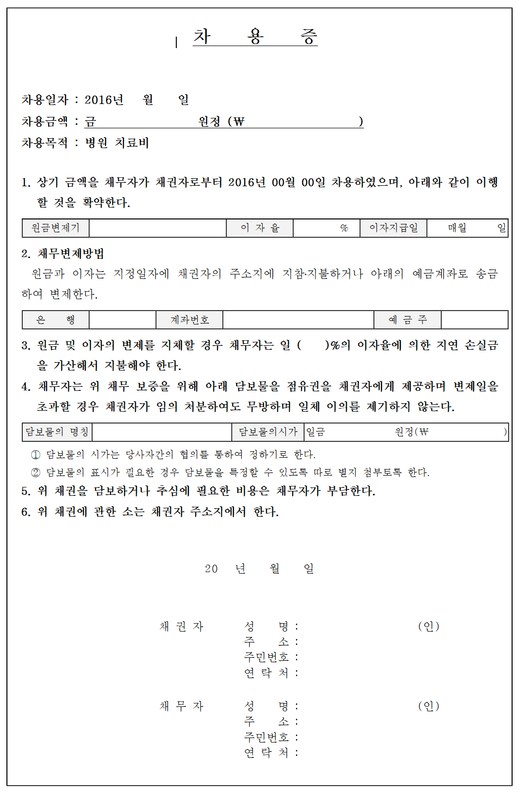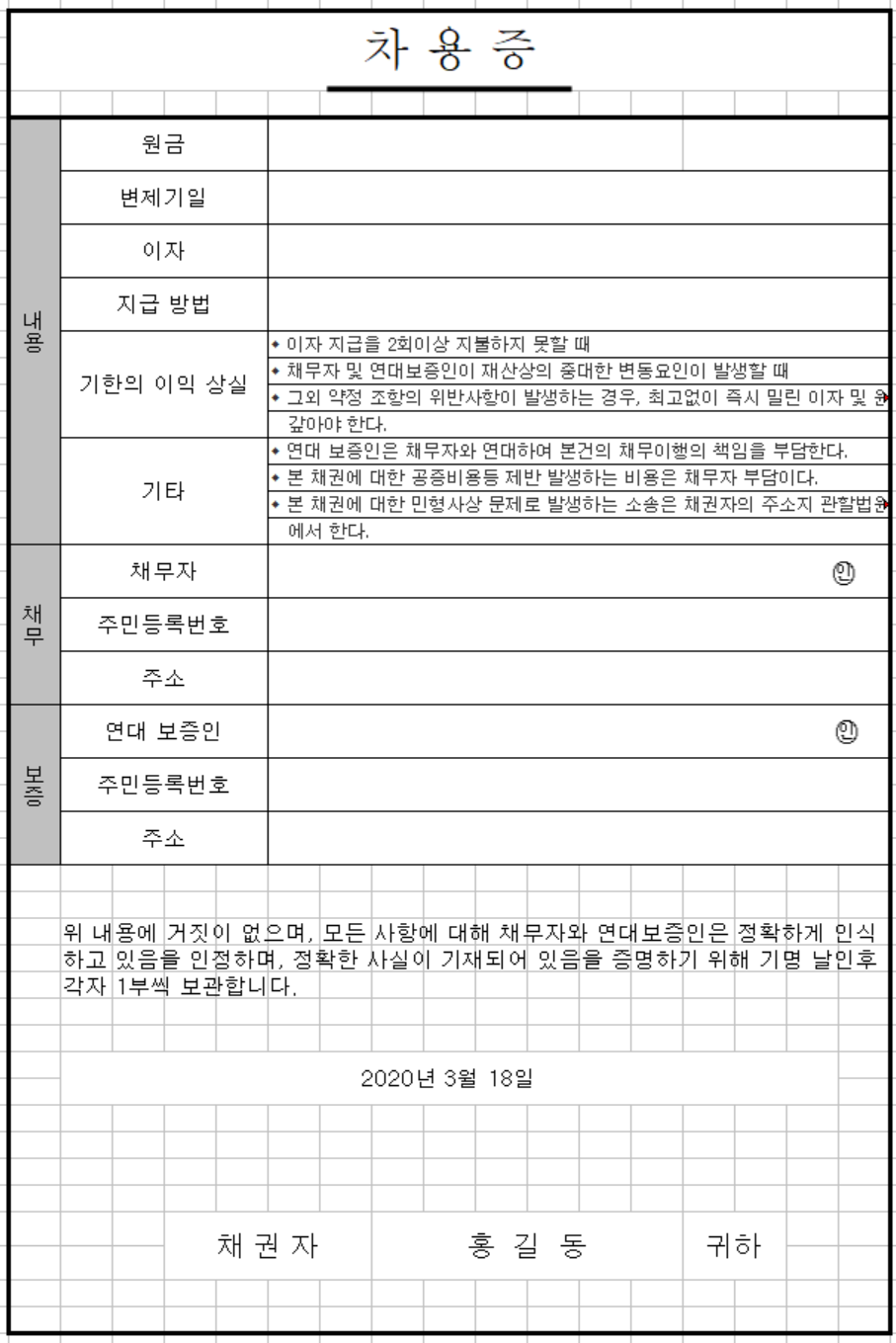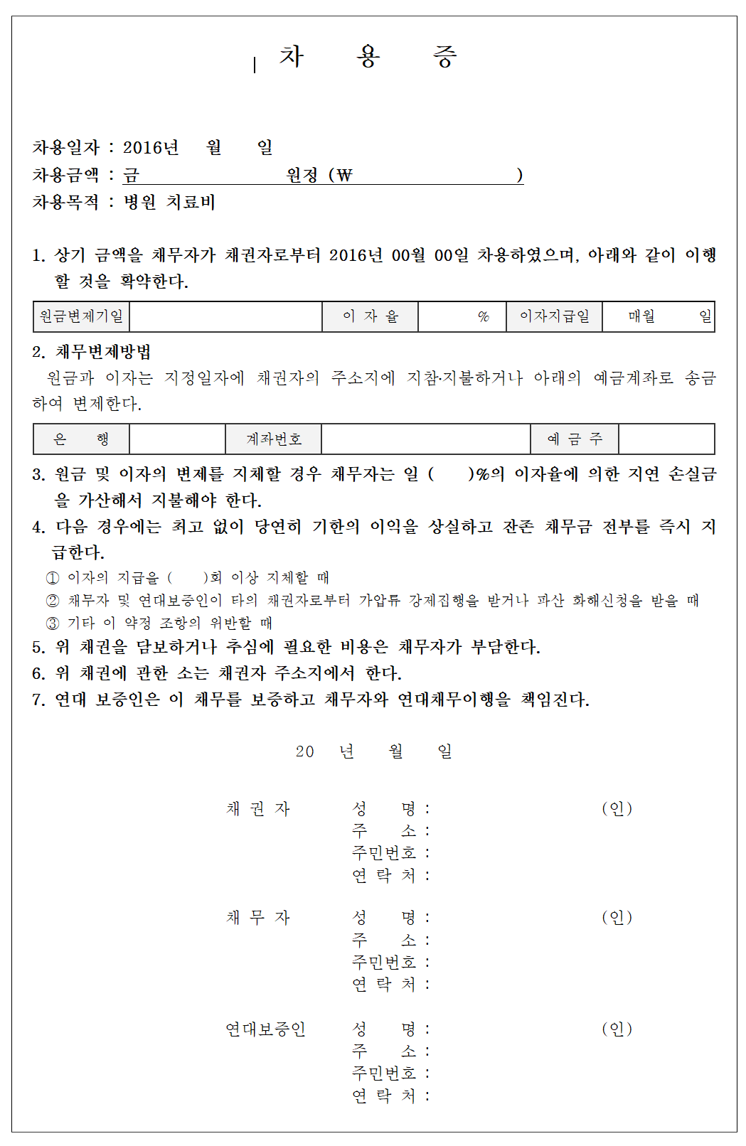 돈을 빌리거나 빌려줄때 필히 사용하는 차용증 양식 무료 다운르드입니다.