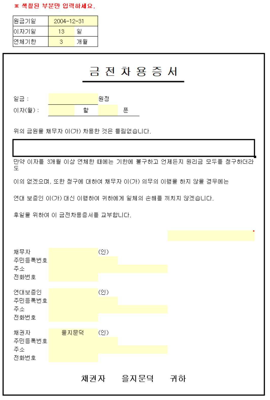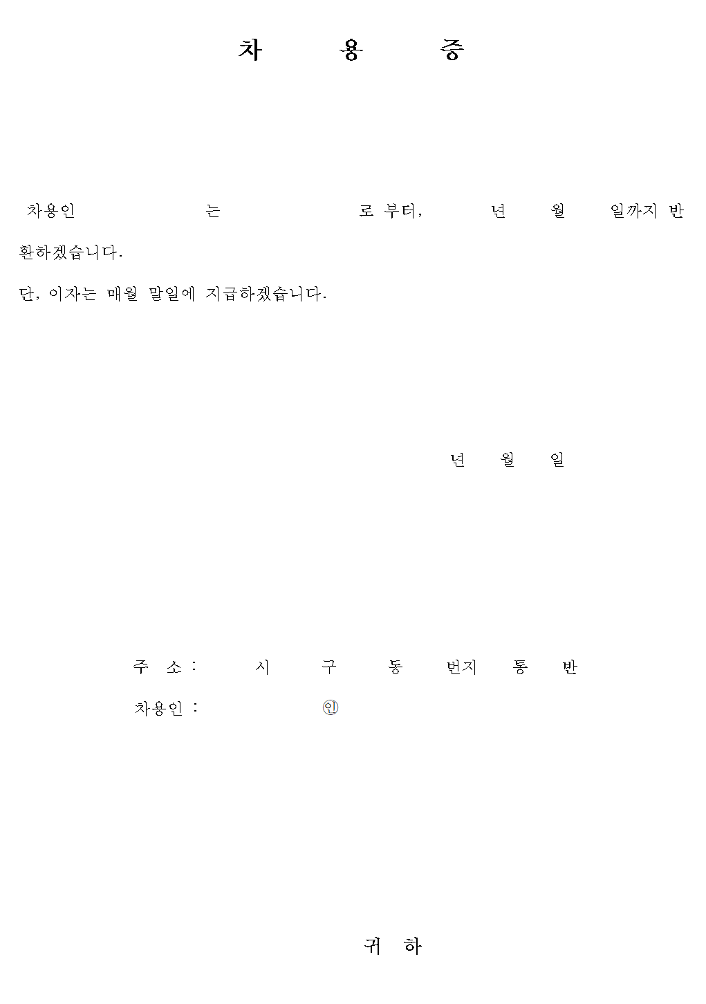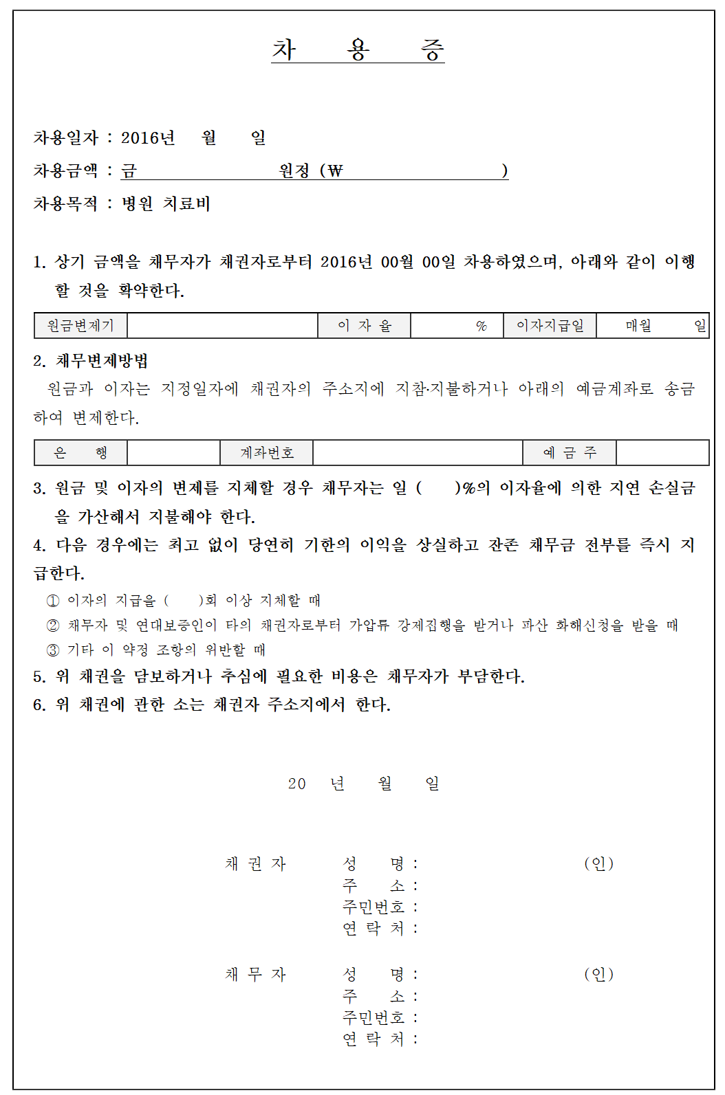돈을 빌리거나 빌려줄때 필히 사용하는 차용증 양식 무료 다운르드입니다.