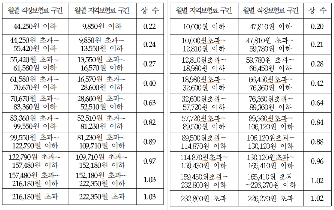 월별 지역 보험료의 분위별 해당 보험료 및 상수 조정, 구간별 본인부담상한액 기준금액 개정이다.
