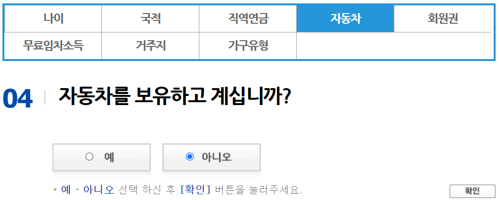 자동차 재산 선정에서 국가유공자, 장애인(등급무관), 제4조에 따라 과세하지 아니하는 자동차는 재산 산정에서 제외된다.