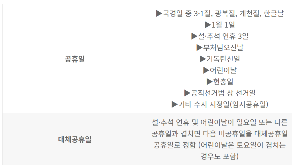 휴일에 일을 하면 가산으로 인해 급여가 달라지기 때문에 휴일과 급여에 대한 보장을 받기 위해서는 휴일을 정확히 알 필요가 있다.