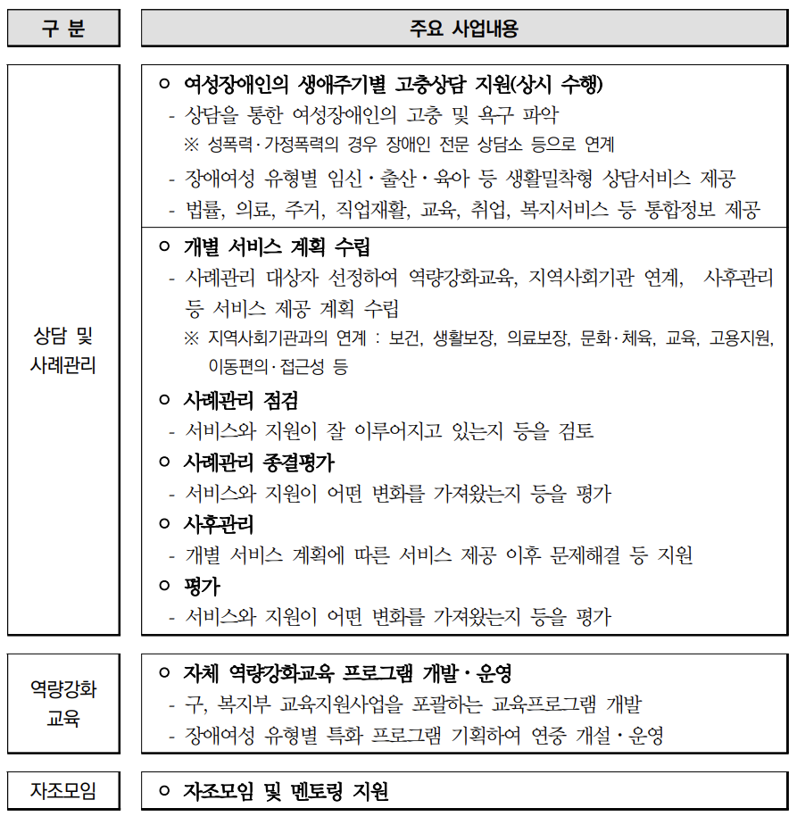 "장애와 여성이라는 이중제약으로 역량강화의 기회를 갖지 못한 여성장애인들에게 상담 및 사례 관리 점검을 통해 양질의 맞춤형 서비스를 제공하여 여성장애인의 역량강화와 사회참여 기회 확대할 수 있도록 도움을 준다."