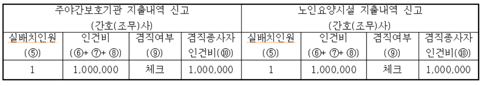 ② 간호(조무)사의 인건비 200만원을 노인요양시설에서 100만원 지출하고, 주야간보호기관에서 100만원 지출하는 경우