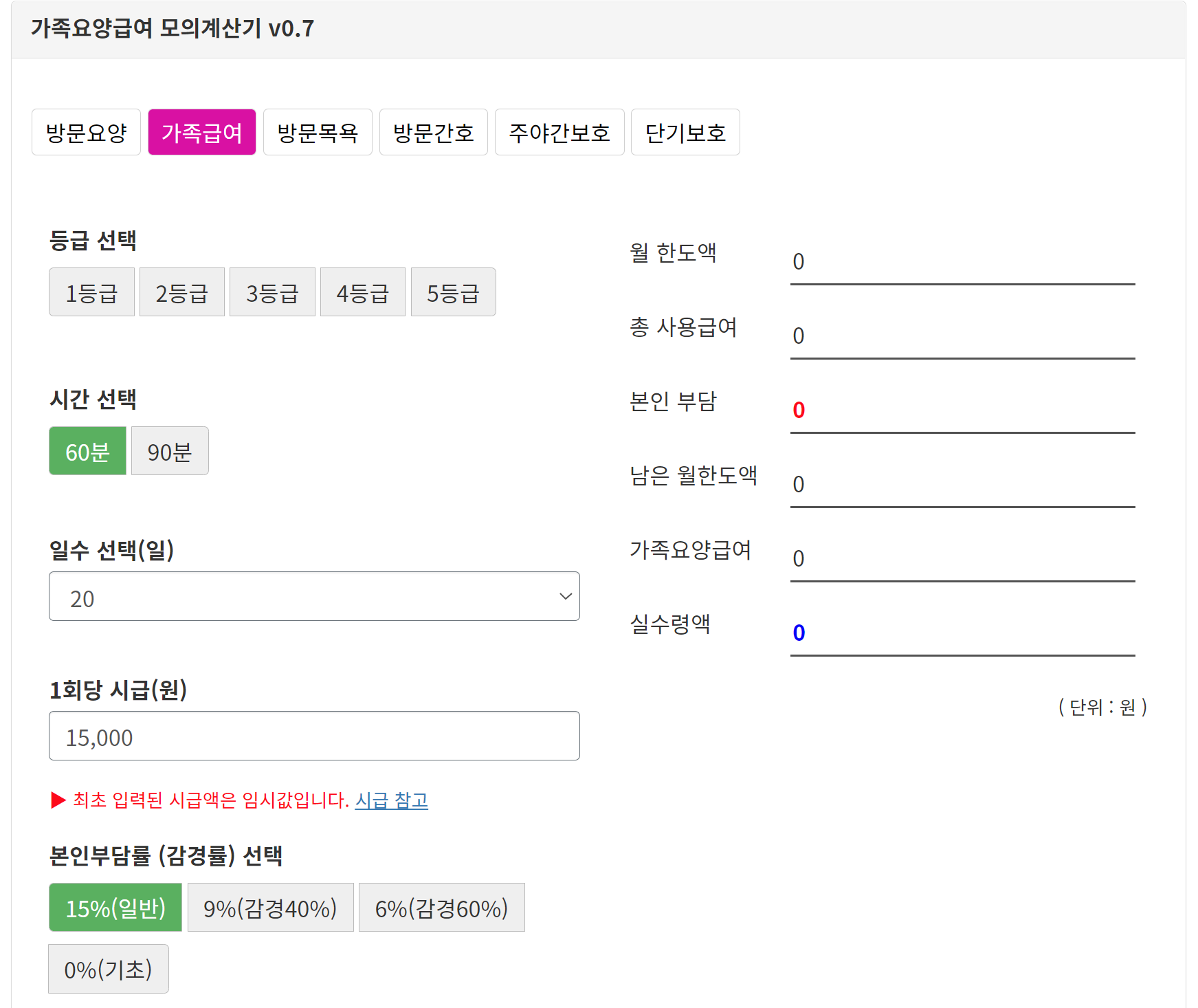 재가요양기관마다 가족요양시급은 다르기 때문에 기본값은 임시 값이며 실제 시급이 아니다.
