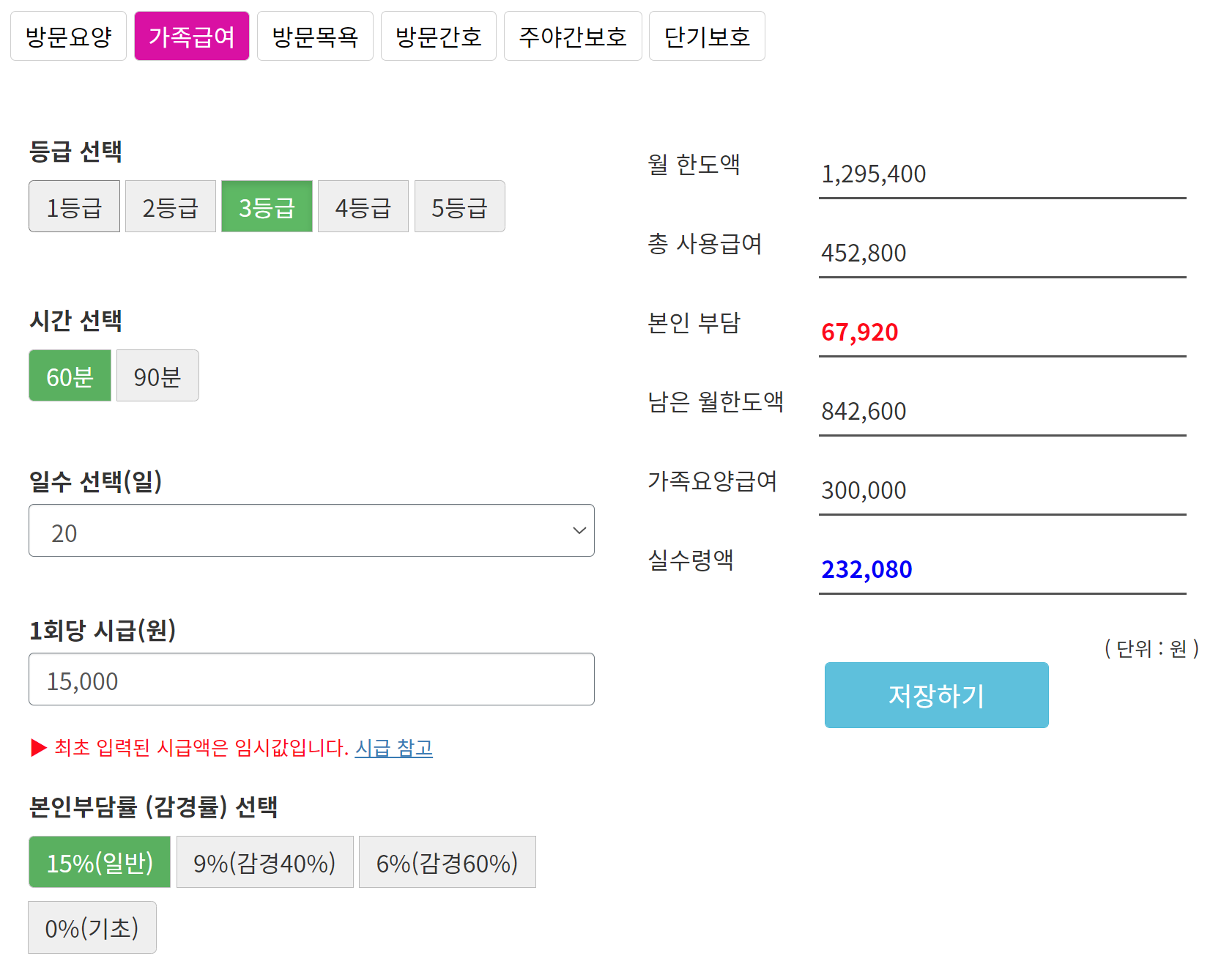 등급만 선택해도 기본값에 의해 가족요양급여를 확인할 수 있다.