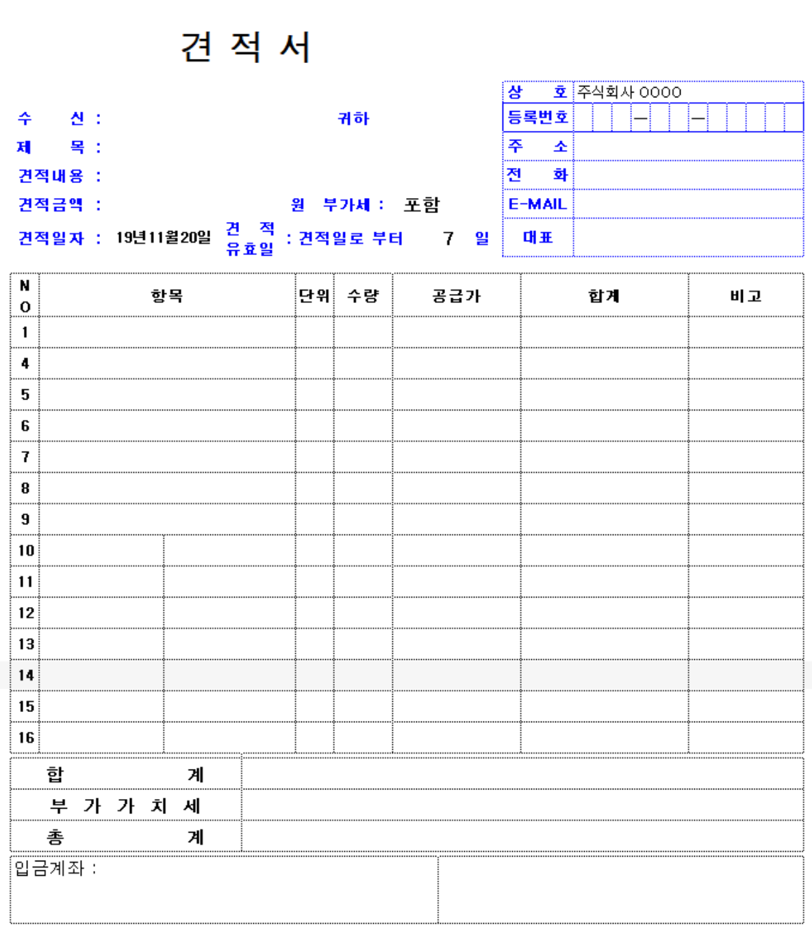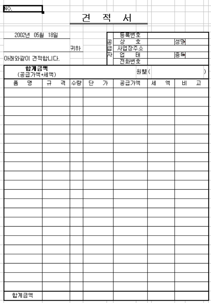 부가세를 구분되어 있지 않는 세액 미표기 견적서 양식입니다.
