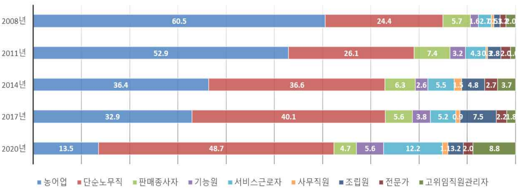 2008년에서는 60.5%가 농어업에 종사했으나 2020년에는 48.7%가 단순노무직으로 가장 높았다.