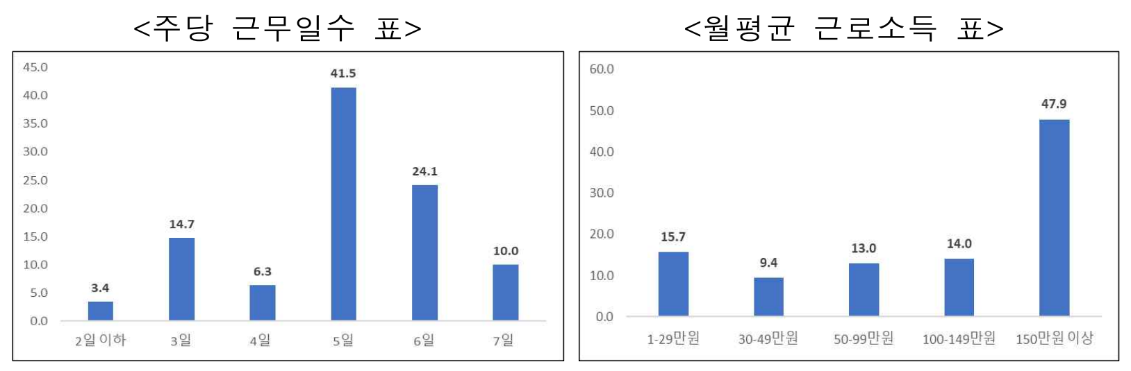 경제활동에 참여하고 있는 노인의 41.5%는 주5일 근무하며, 47.9%는 월 150만 원 이상의 근로소득이 있다.