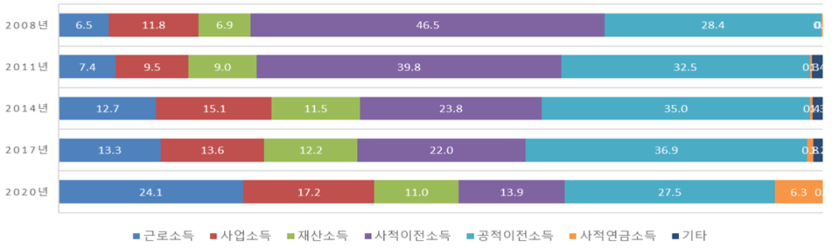 노인의 소득은이중 근로/사업소득, 사적연금소득 등의 큰 향상을 보여 경제적 자립성이 높아지고 있는 특성을 보이고 있다.