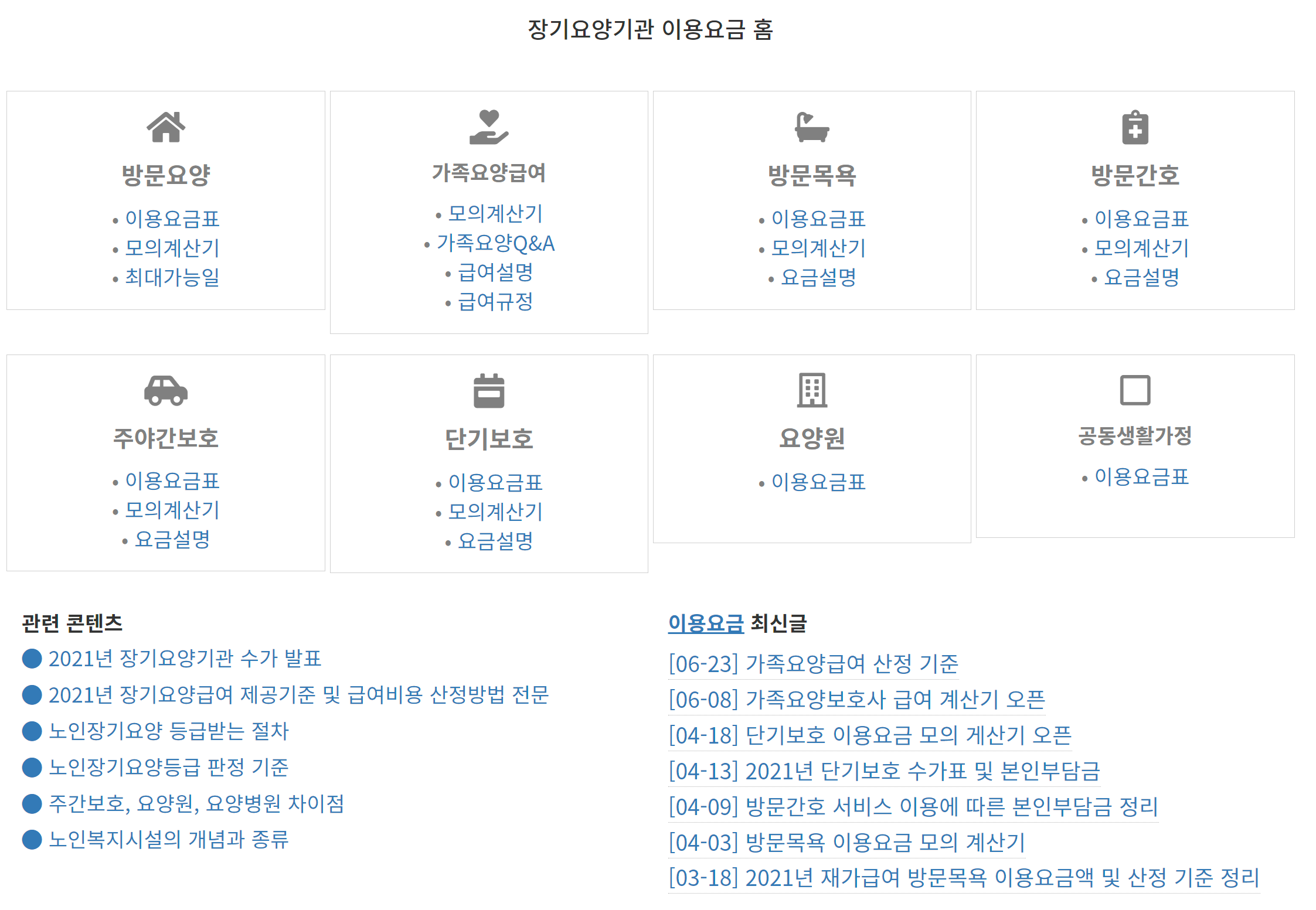 2021년 수가표와 산정방법, 등급을 받는 절차 등 장기요양이용요금 관련된 콘텐츠를 한 곳에 정리되어 있다.