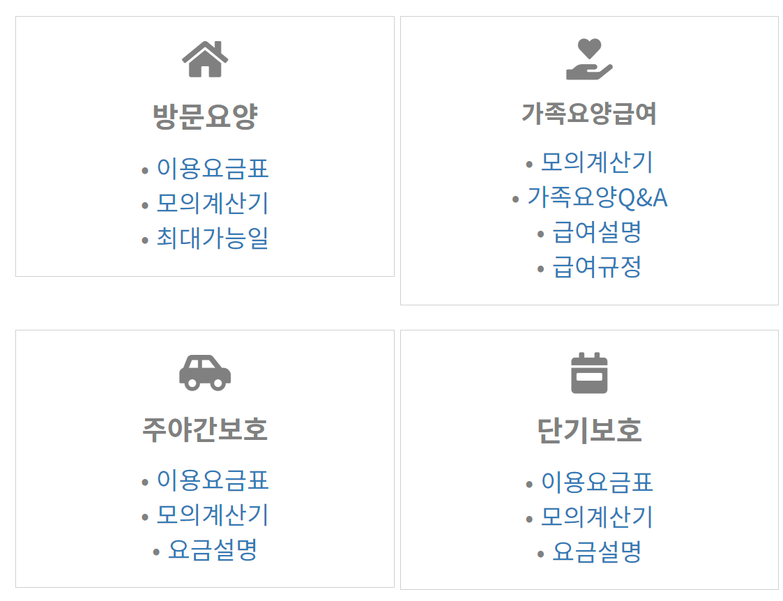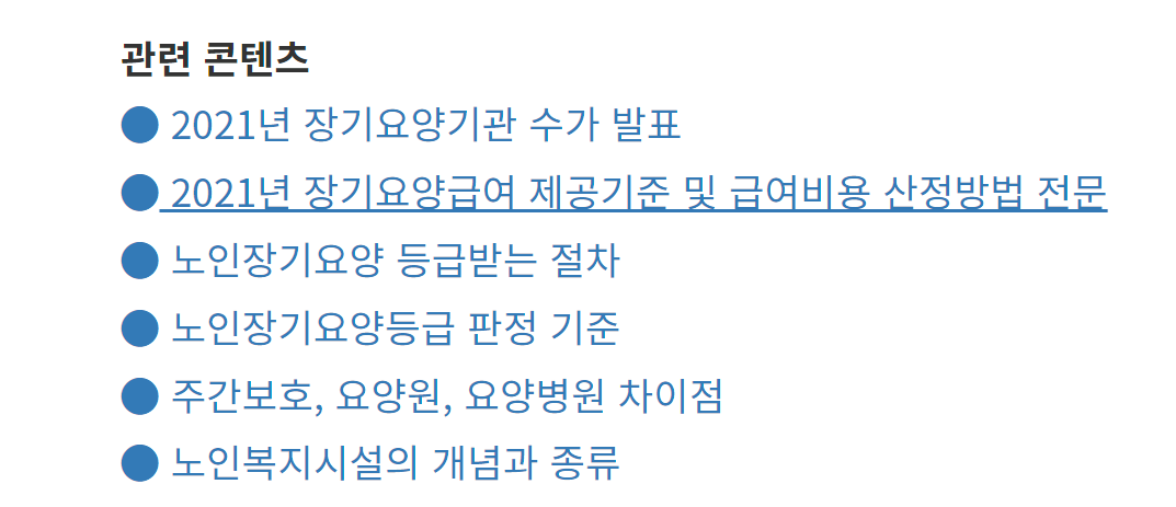 2021년 수가표와 산정방법, 등급을 받는 절차 등 장기요양이용요금 관련된 콘텐츠를 한 곳에 정리되어 있다.
