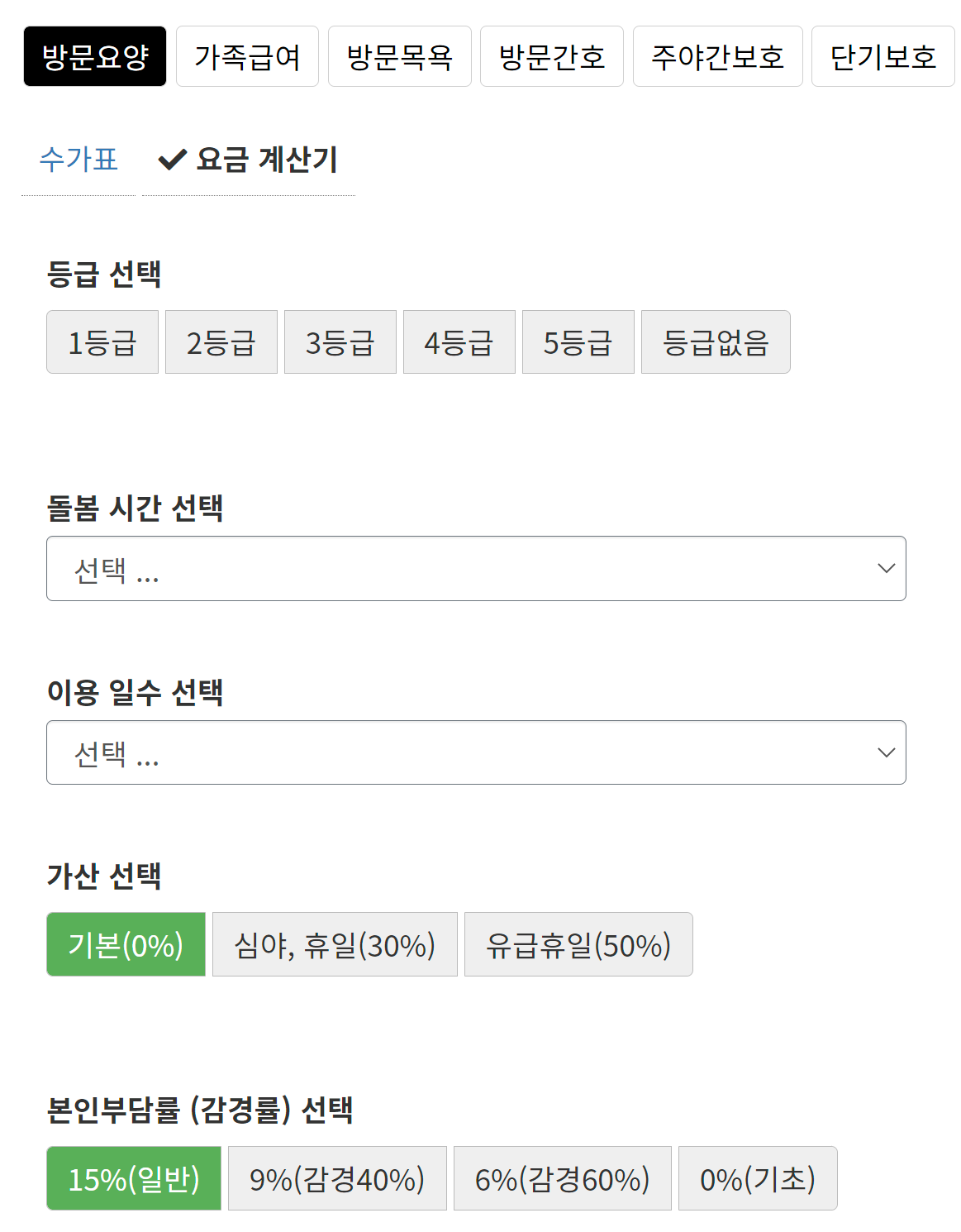이용요금 홈은 장기요양기관별로 서비스 이용 시 이용요금표, 모의계산기, 급여설명이 나눠져 있다.