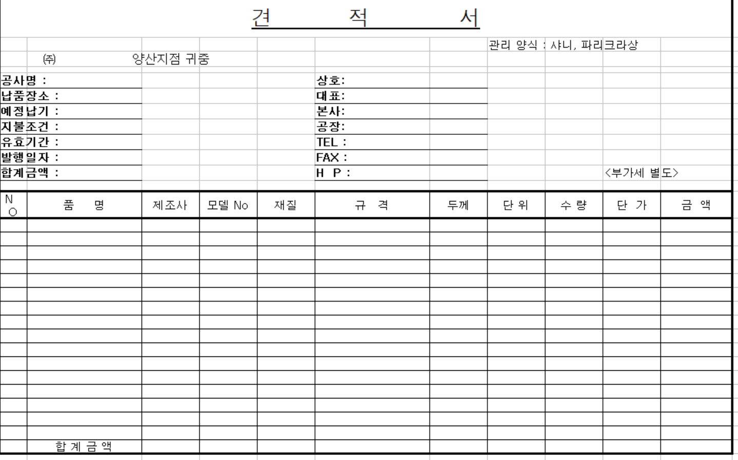 부가세를 구분되어 있지 않는 세액 미표기 견적서 양식입니다.