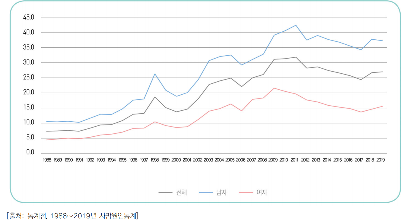 1988~2019년 자살률 추이 ( 단위 : 인구 10만 명당 명 )