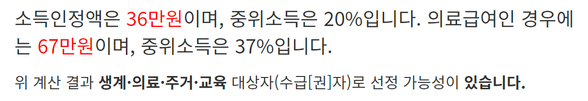 예를 들어 소득인정액이 50만원 미만이면 생계급여, 의료급여, 주거급여, 교육급여 모든 수급자 조건에 해당되지만 80만원이 나오면 주거급여와 교육급여만 조건에 해당된다.