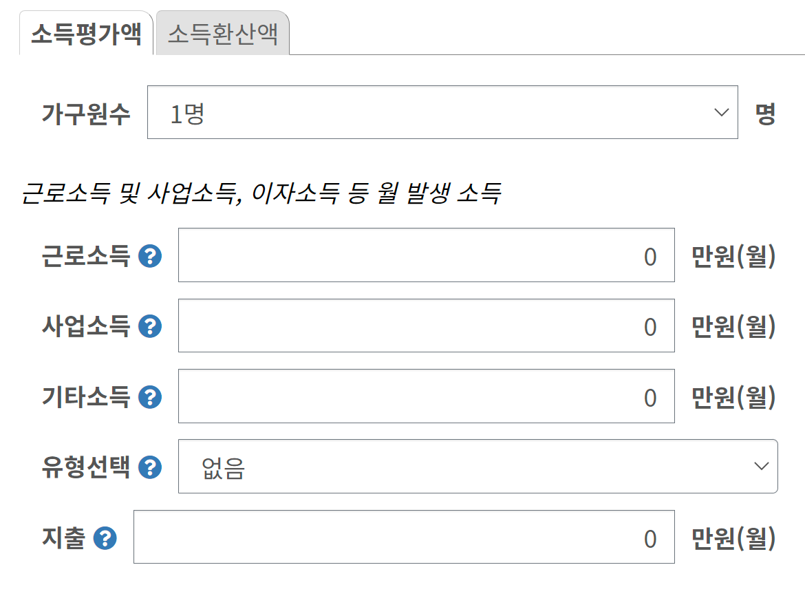 모의계산기는 소득평가액과 소득환산액을 따라 계산하도록 되어 있다.