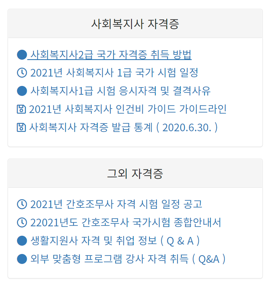 그 외에 사회복지사, 간호조무사 자격증 취득을 위한 일정과 생활지원사, 외부 맞춤형 프로그램 강사 등 장기요양기관에서 근무하는 종사자에 대한 정보를 제공하고 있다.