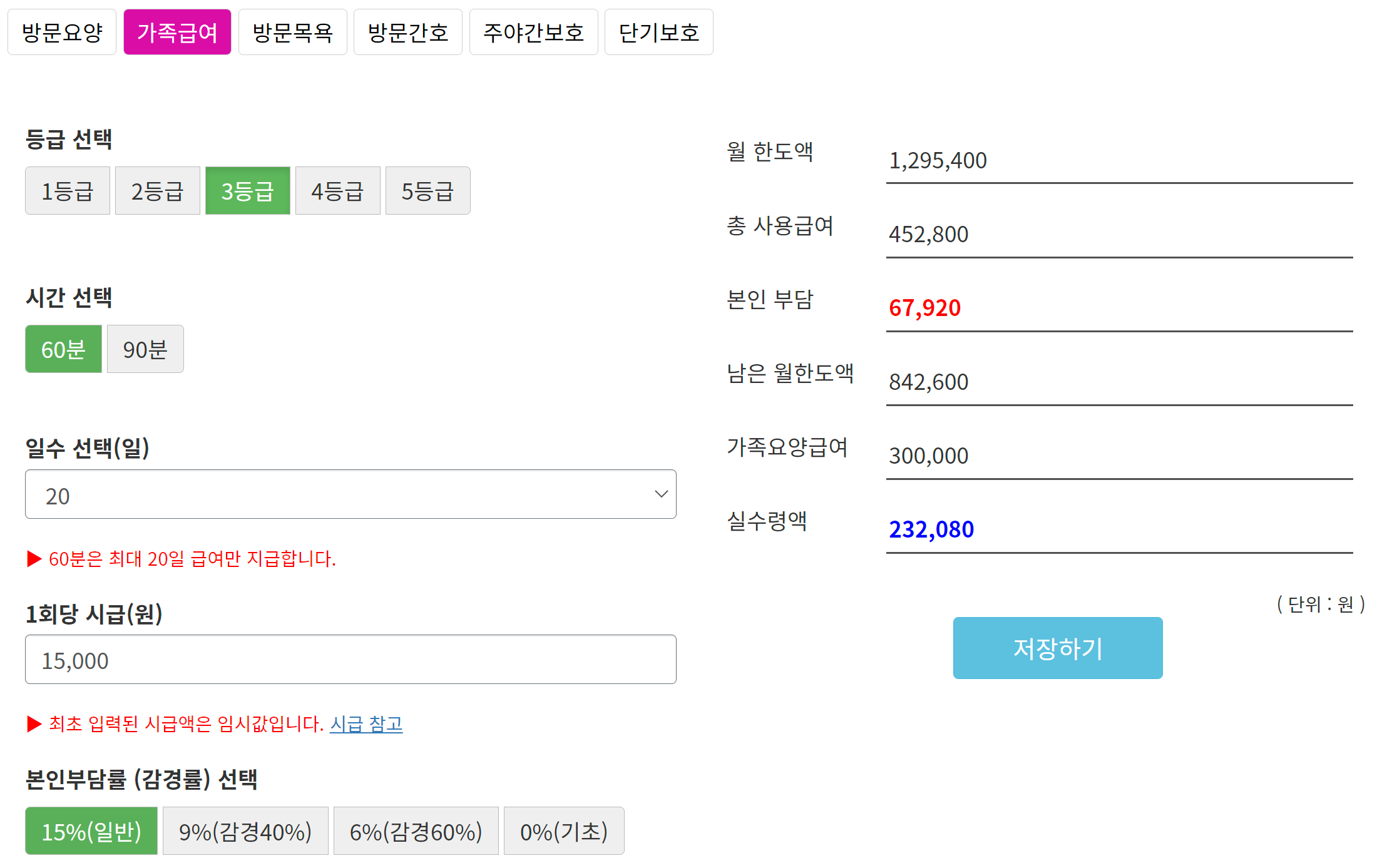아래는 가족요양 모의계산기의 예시 화면이다.