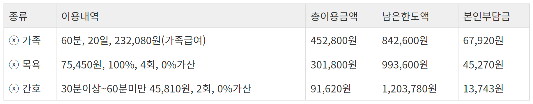 아래의 표는 재가 급여 중 가족요양 60분-20일, 방문목욕 4회, 방문간호 2회를 계산한 내용이다.