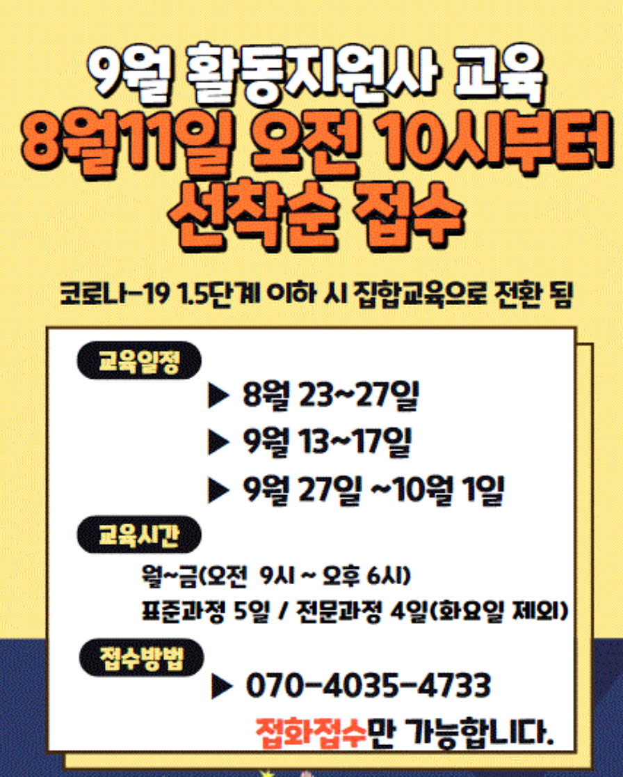 | 토요일 진행하는 활동지원사 교육은 10월 16일에 시작예정으로 9월 초에 접수받습니다. [출처] 행복미래교육원 21년 9월 활동지원사 교육일정 안내|작성자 행복미래교육원 |