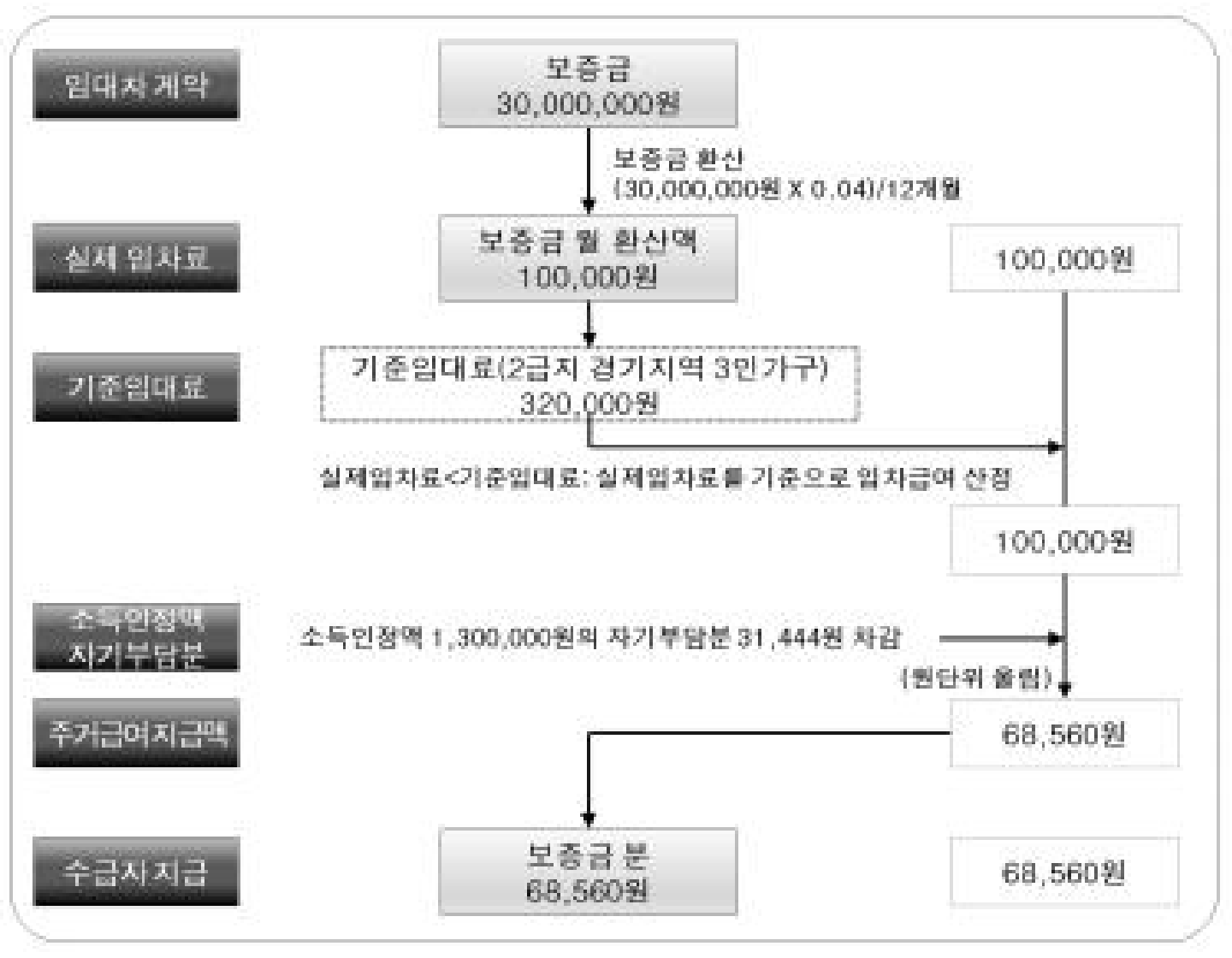 수급자의 소득인정액이 생계급여 선정기준액보다 적으면 전액 지급하고 소득인정액이 생계급여 선정액보다 높은 경우에는 기준임대료에서 자기부담분을 공제하고 지급한다.