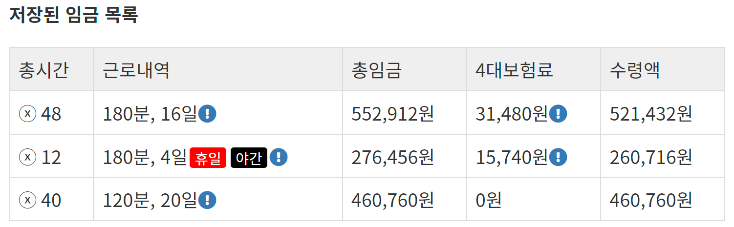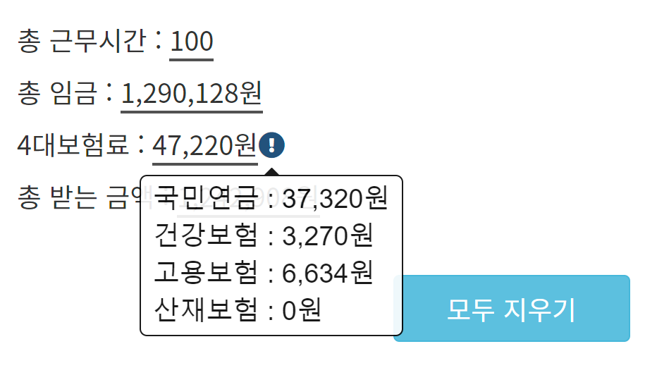 저장된 총 임금과 근로자 부담 4대보험 금액을 산출해 준다.