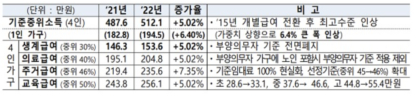 기준중위소득 인상에 따른 생계급여 등 변동 내용
